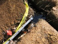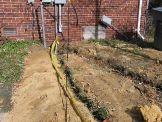 ![]() Trenches for the electrical cables. Our incoming power will be underground to the meter, then back underground to the garage. While the trench was open, I put in a couple of conduits for computer cables. Then it rained and the trenches are full of water. |