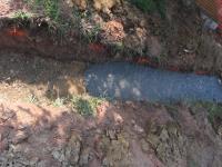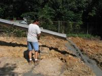 They're pouring the footings. There's a "C"-shaped trench (no footings under the garage door) and the concrete truck backs up to the front edge of the trench. With their longest chute, it comes a few feet short of the back part of the trench. No problem: raise the chute up and put the truck in high. The "waterfall" of concrete hits just on the lip of the trench and flows on in. The concrete was very soupy and they were able to flow it into the entire perimeter from about 3 pouring points. A quick swish with the float to ensure it's level to the painted marks and that there is no aggregate on the surface and they're done. Elapsed time, maybe an hour. Considering the solidity of our soil, I was not surprised that they didn't need forms. However, I was expecting at least some mesh, if not rebar; but there is no steel in our footings. |