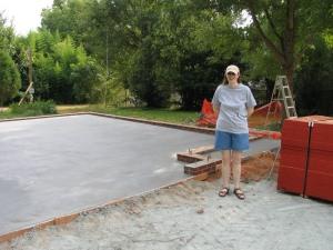There was also stone dust covering some, but not all, of the new driveway and a good bit of the yard. I called the project supervisor, concerned that they thought that would be the area to pave. He reassured me that they just spread out the left over to cut down on mud. Wednesday I watched the webcam and saw that it took 2 concrete trucks to pour the slab. When I got home; there was an old man sitting, waiting to smooth it every 15 minutes or so. By the time Patricia got here it was to late to add our handprints. We'll have to anoint it with paint. |